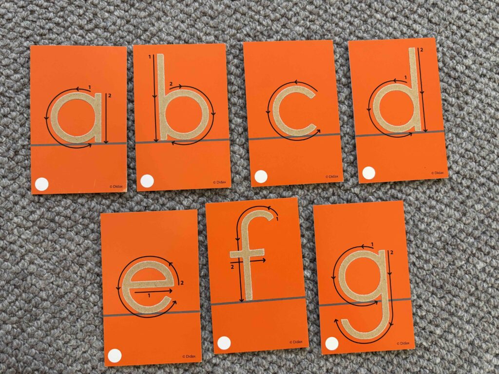 Just like sand trays, sandpaper letters have been used for many years in Montessori education. This tool works really well because it combines movement touch and sound, as the idea is to finger trace the letters while saying their sounds to strengthen letter to sound connection.